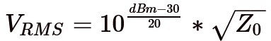La prima parte della formula converte il valore in dBm in potenza in watt. La seconda parte calcola la tensione efficace Vrms utilizzando l’impedenza caratteristica del circuito. Questo permette di capire come la potenza in ingresso si traduce in una tensione misurabile sul carico.