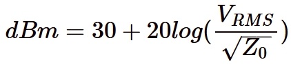 dBm = 10 × log10(P(W) × 1000) = 20 × log10(V_rms) + 30 − 10 × log10(R)
