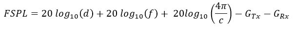 FSPL(dB) = 20 × log₁₀(d) + 20 × log₁₀(f) + 92.45 – Gtx – Grx